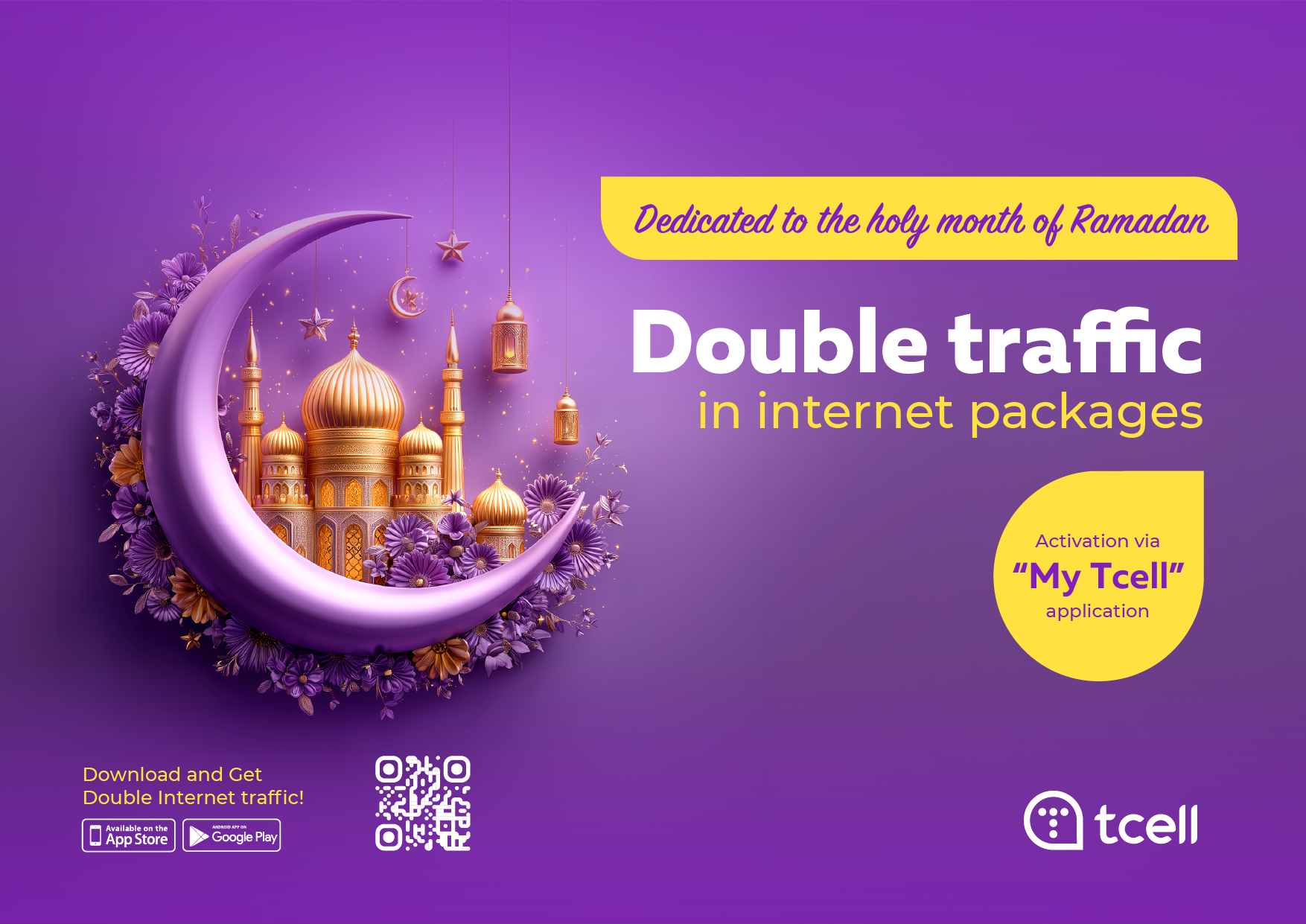 In honor of the holy month of Ramadan, we are pleased to introduce the “Double Internet Traffic” promotion! Activate internet packages via the My Tcell app and receive double the internet data volume.